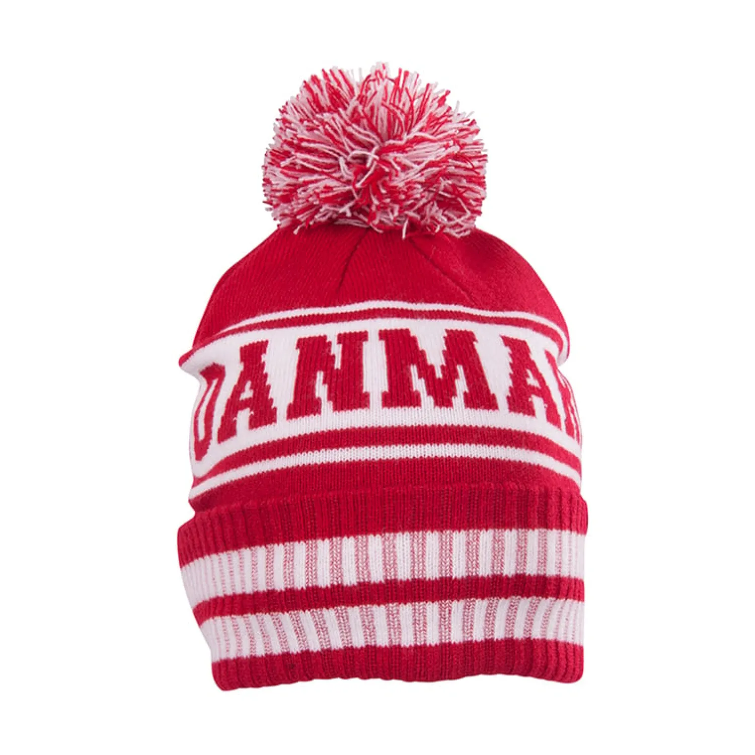 Värmande mössa i Danmarks färger med pompom och ribbstickad kant.